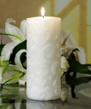 6333 LumireD'esprit Carved Lacquered Pillar Candle Show off your exquisite Carved Lacquered Pillar Candle as it puts off a wonderful and romantic light. The damask pattern carved intothe ivory colored unscented lacquered candle creates a wonderful atmosphere forspecial occasions. This is the perfect Wedding Unity candle. Always use acandle holder. Look for other coordinating pieces of the LumireD'esprit Crystal and Candle Collection. Includes:* 3 d x 7 h Carved Lacquered Pillar Candle ivorycolored (unscented) weighs approx 1.5 lbs.* Makes a wonderful gift Weight approximately 1.6 lbs. *Oversized box ships at 4 lbs Case Quantity : 12 Occasions : Wedding Read more...